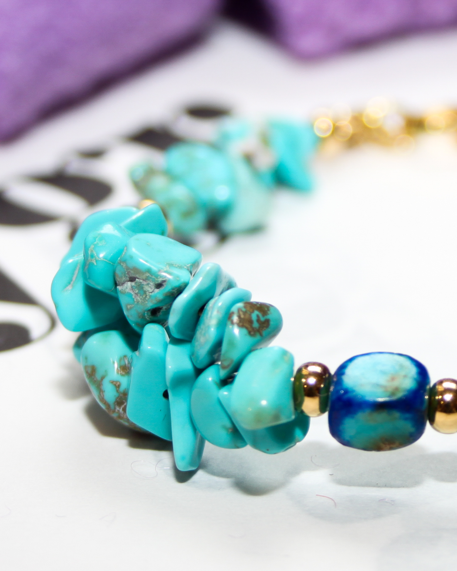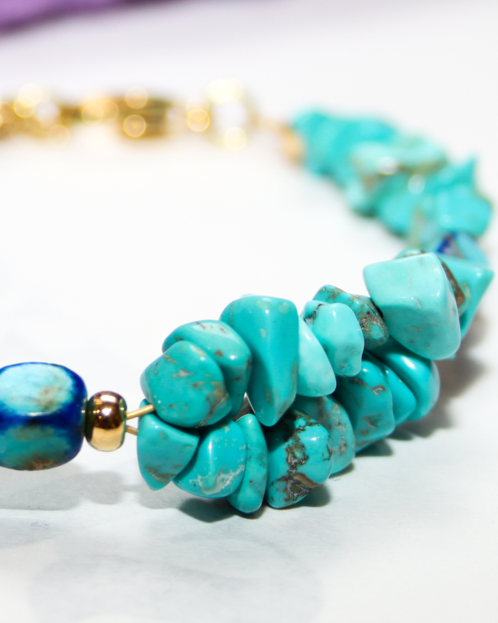 Featuring asymmetrical turquoise gemstone beads and blue-hued beads framed by 24K gold-plated accents. Vibrant, elegant, and captivating.