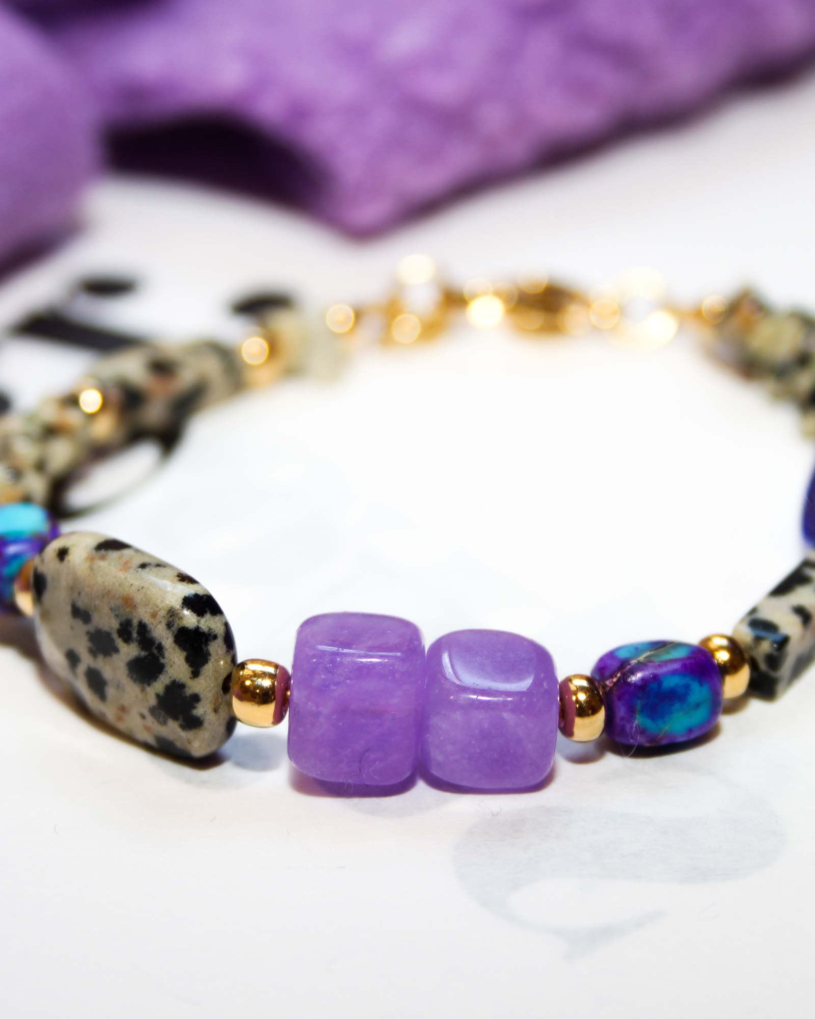 An artful asymmetrical design featuring Dalmatian Jasper, deep blue and purple beads, and 24K gold-plated accents. Bold, elegant, and effortlessly elegant.