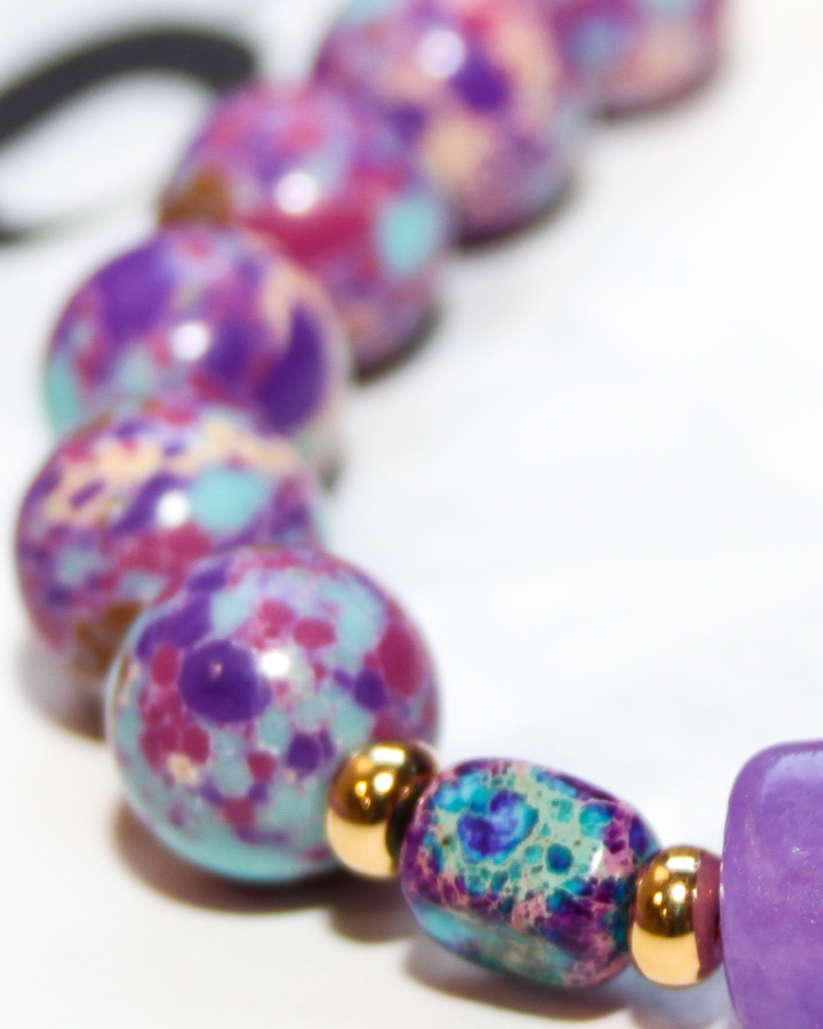 A striking mix of squared purple beads and speckled gemstone-look beads, accented with 24K gold-plated and blue-hued stones. Colorful, refined, and effortlessly striking.
