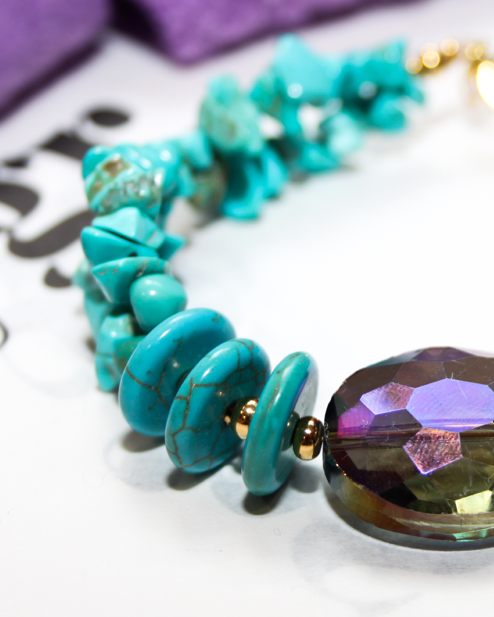 A dazzling mix of turquoise gemstone-look beads with 24K gold accents, crowned by a large faceted bead that shimmers in purple and green. Magical, vibrant, and utterly captivating.