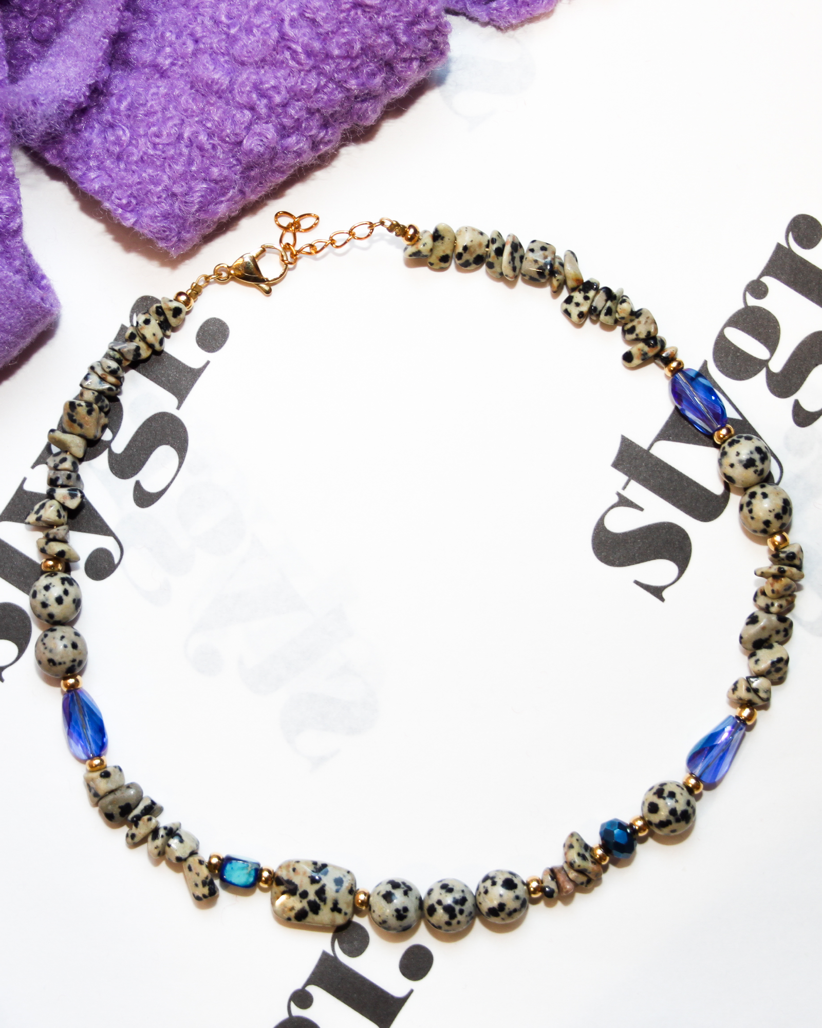 A sophisticated blend of Dalmatian Jasper and deep blue beads, accented with 24K gold-plated details. Handmade in Haarlem, a cute and elegant statement piece.