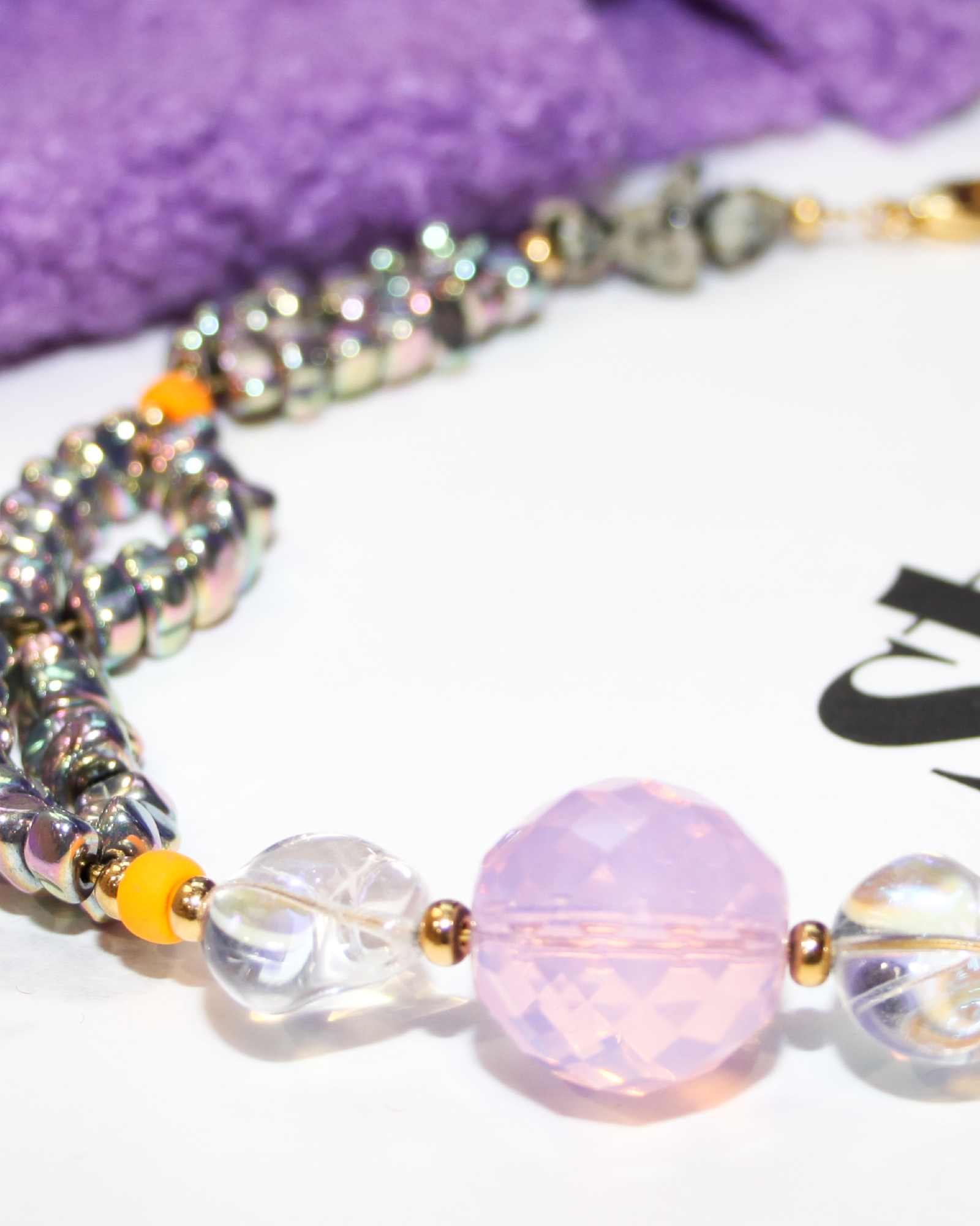 This statement piece features a pink artisan glass bead at its heart, surrounded by shimmering iridescent beads, Dalmatian jasper, silver gemstone-shaped accents, and 24K gold-plated details. Bold, eclectic, and effortlessly chic.