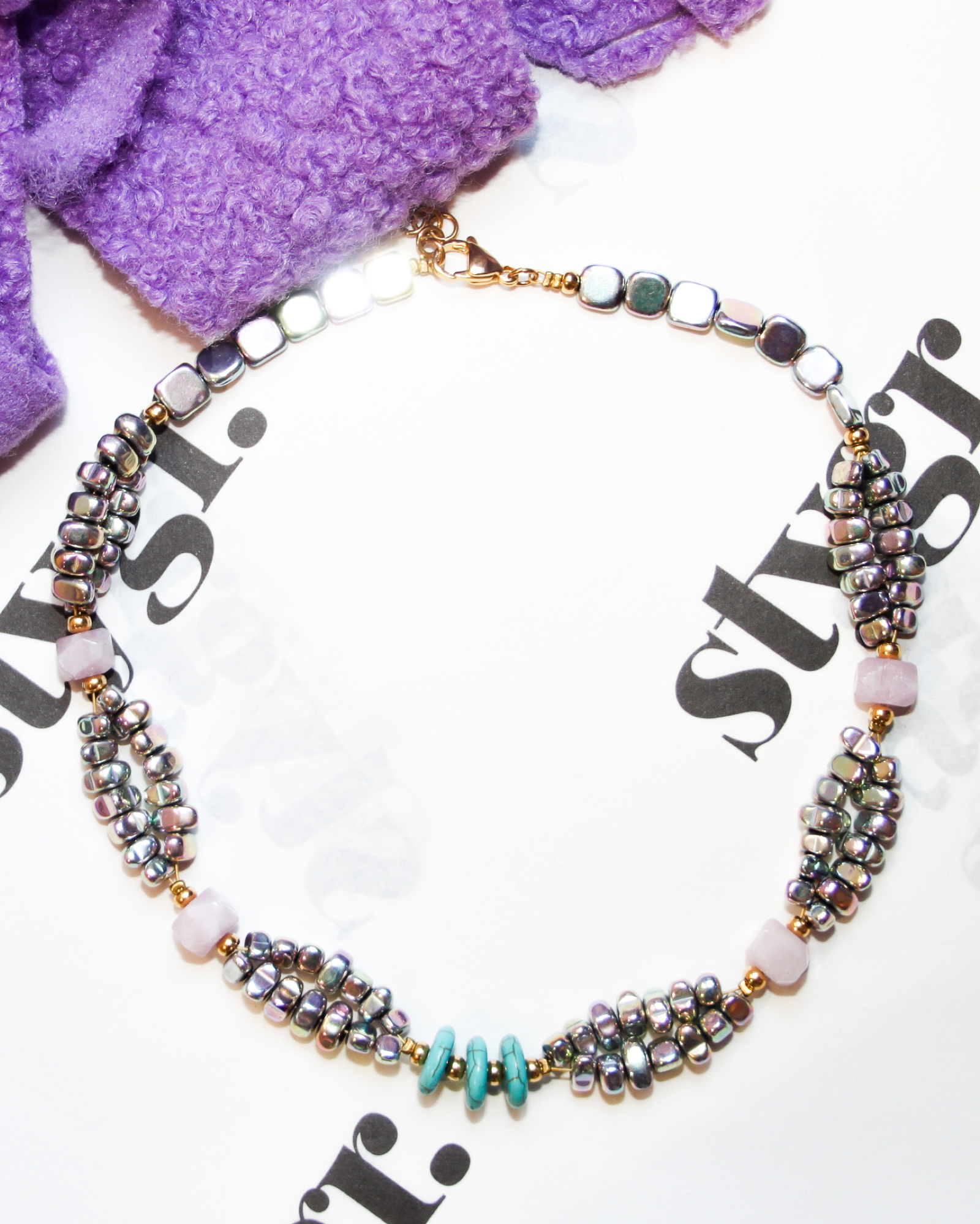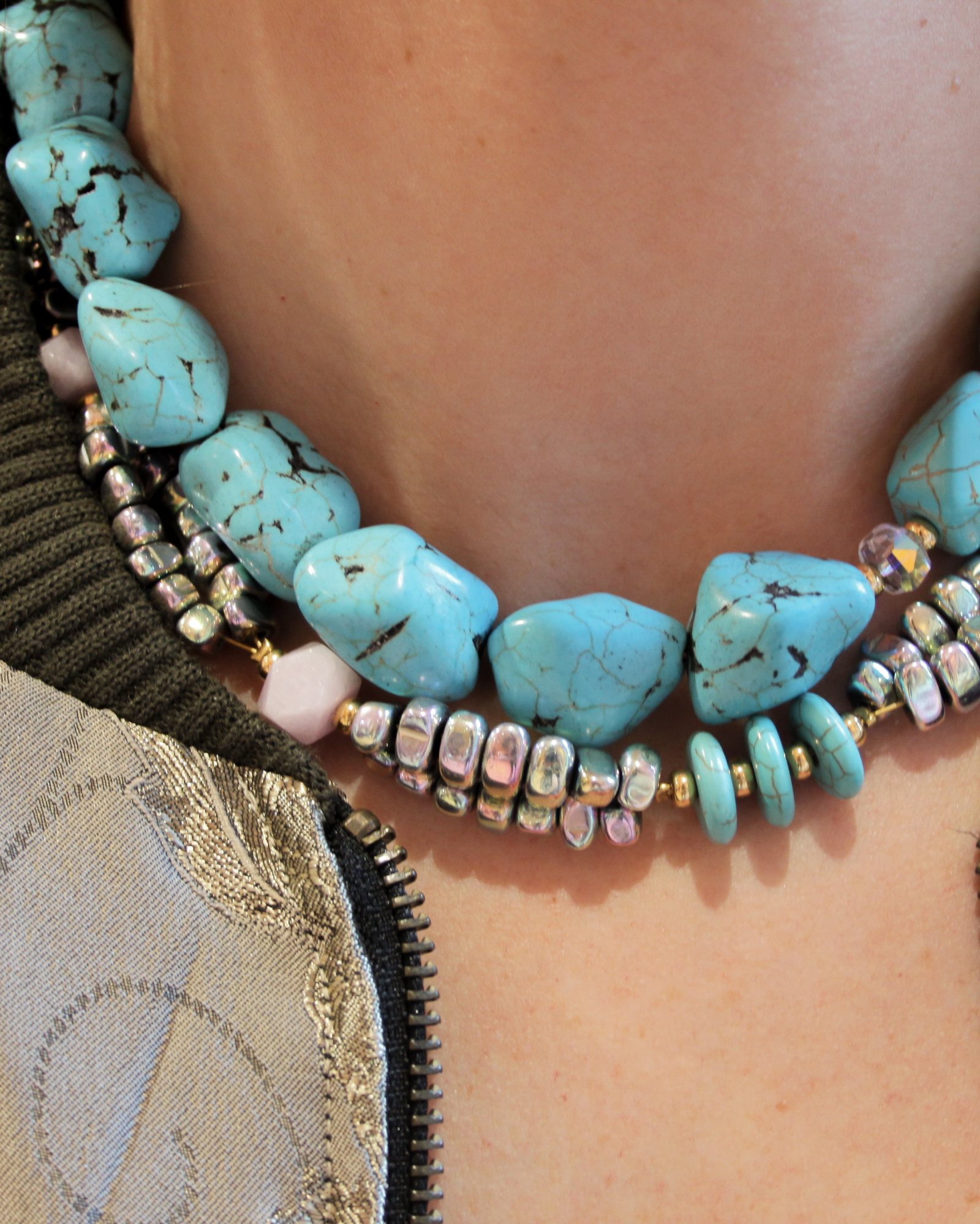 A striking combination of silver gemstone-shaped beads and vibrant turquoise, accented with 24K gold-plated details. Handmade in Haarlem, a bold yet elegant statement piece.