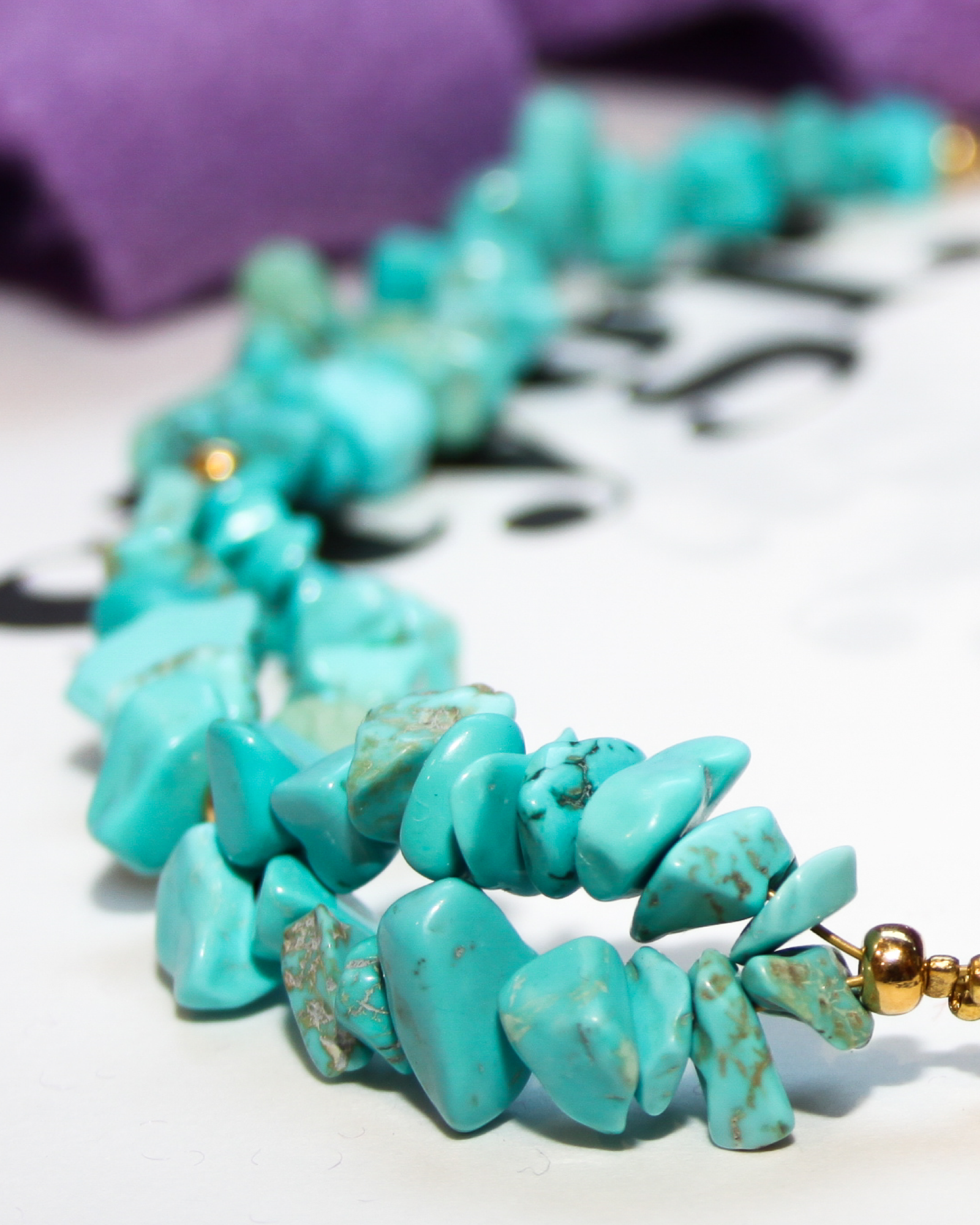 A bold, asymmetrical statement piece featuring turquoise and Dalmatian jasper stones with 24K gold-plated beads. Effortlessly chic with a playful twist.